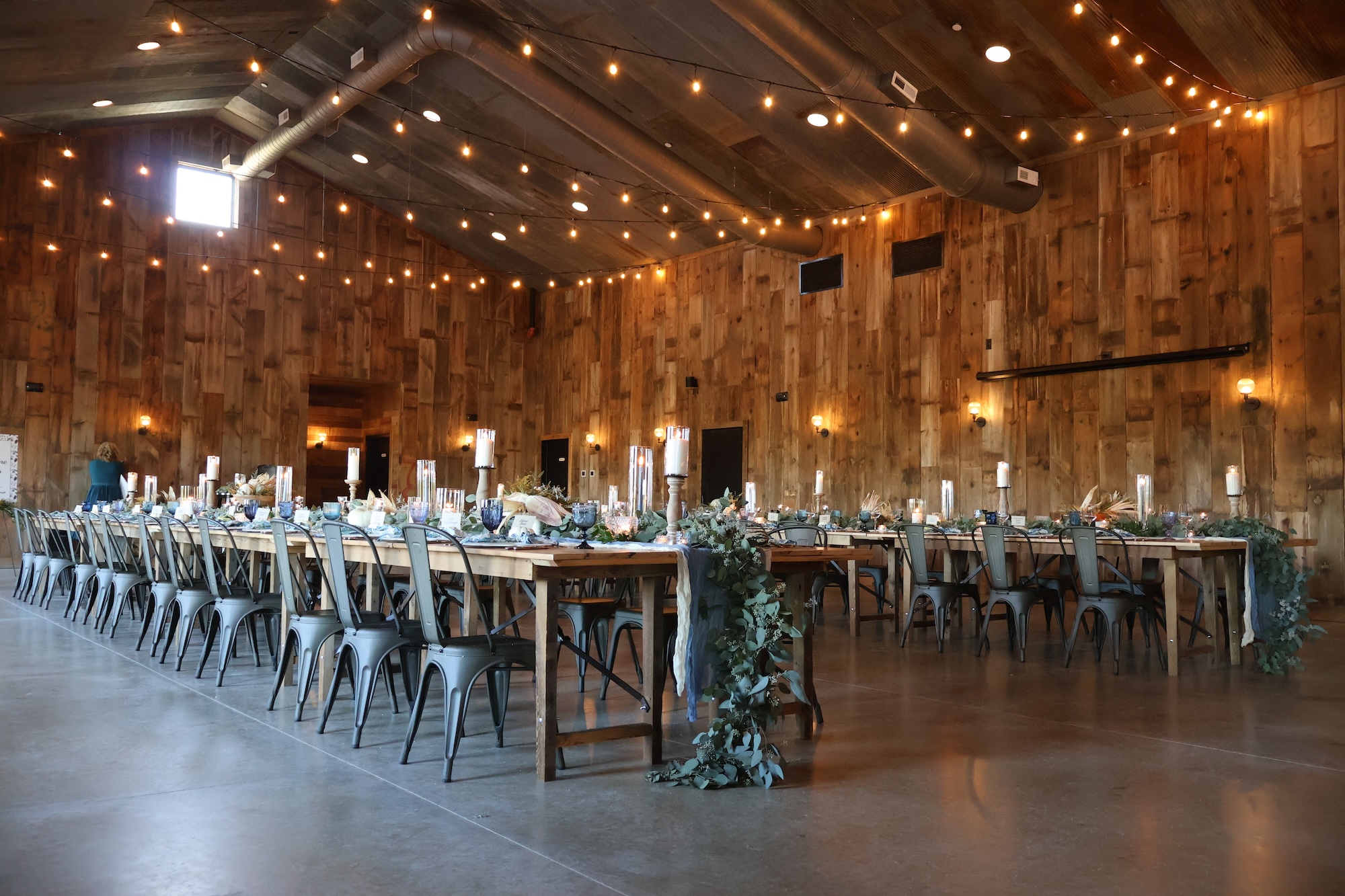 Our indoor event space is warm and inviting featuring reclaimed barn wood siding and beams, 30-foot ceilings, and a beautiful orchard view.